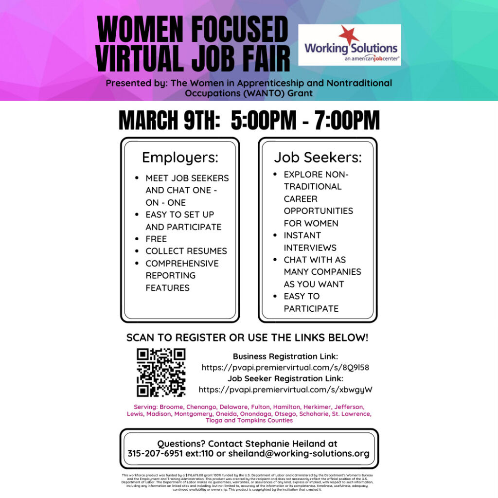 The Workforce Development Board’s Women in Apprenticeship and Nontraditional Occupations (WANTO) grant will hold an evening career fair on Wednesday, March 9th from 5:00pm to 7:00pm.