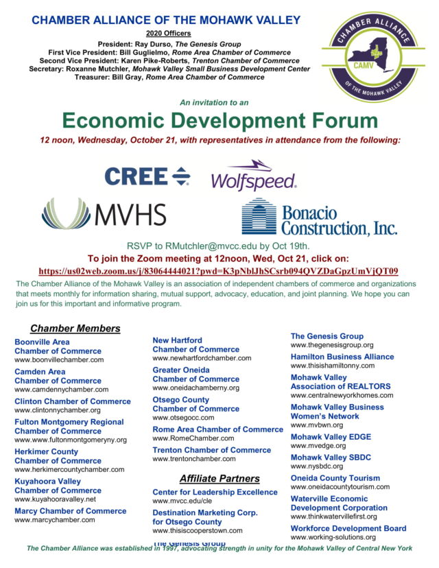 The Mohawk Valley Chamber Alliance is having an Economic Development Forum featuring a Q&A discussion and special guests: