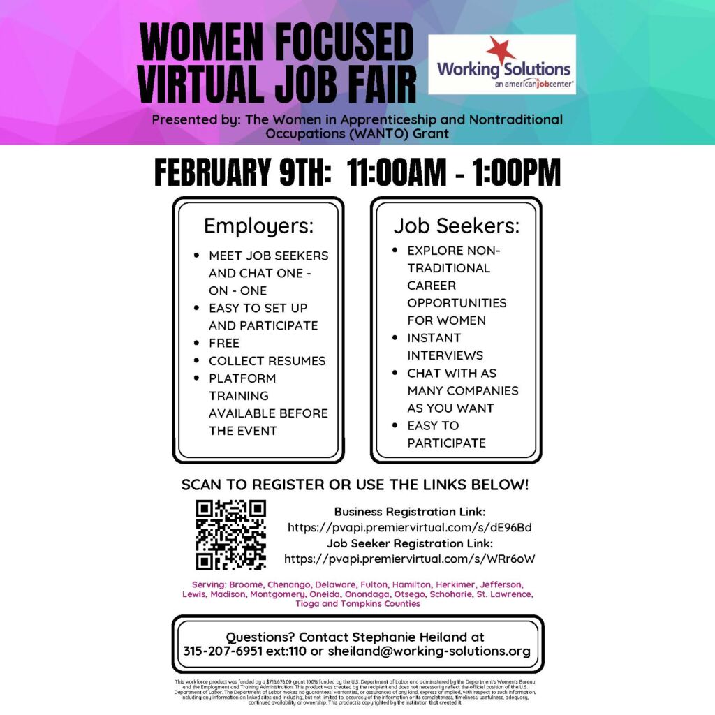 This program is available in Broome, Chenango, Delaware, Fulton, Hamilton, Herkimer, Jefferson, Lewis, Madison, Montgomery, Oneida, Onondaga, Otsego, Schoharie, St. Lawrence, Tioga and Tompkins counties. All businesses and job seekers in these counties are invited to attend!