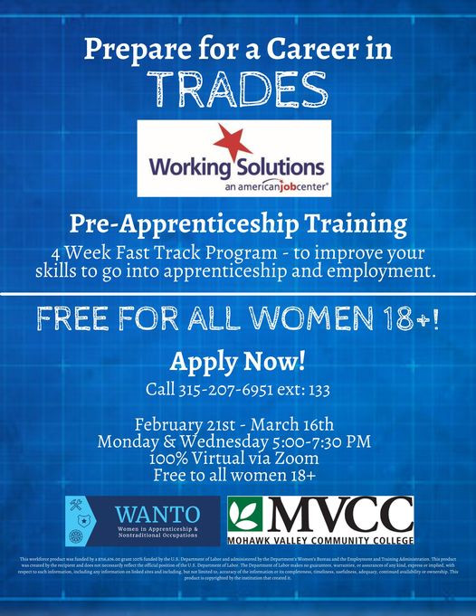 The Workforce Development Board’s Women in Apprenticeship and Nontraditional Occupations (WANTO) grant will hold an evening career fair on Wednesday, March 9th from 5:00pm to 7:00pm.