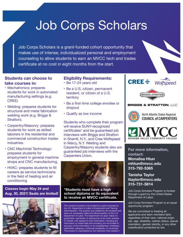 The Job Corps Scholars program at MVCC is now open to US citizens or permanent residents from any community in the Mohawk Valley, across NY state, or out of state. See the updated flyer for more information!