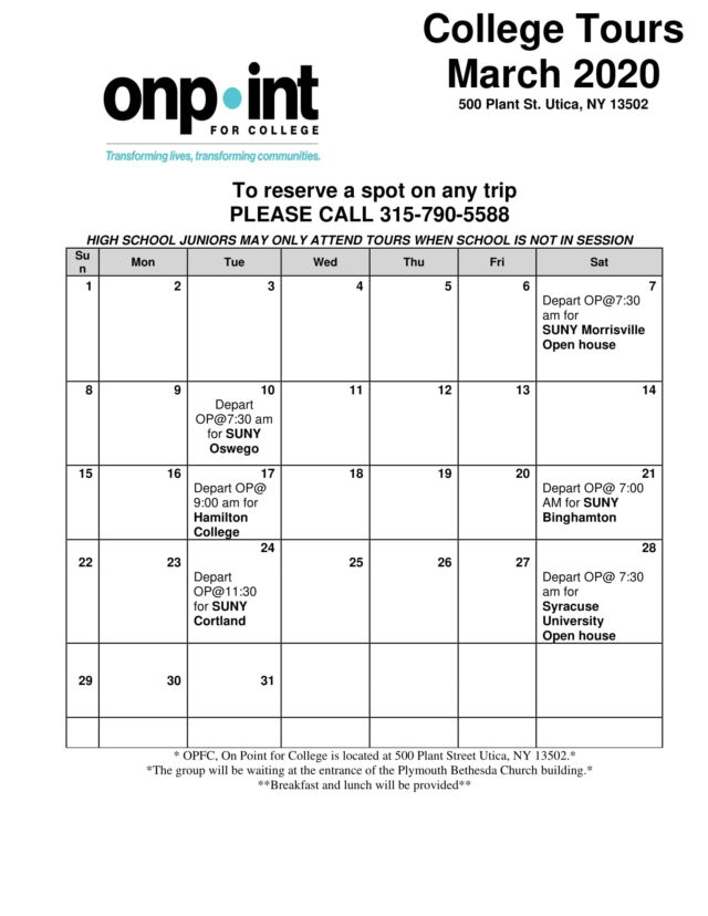The On Point for College program will be having tours in the Spring semester in the months of March and April. See the March dates below!