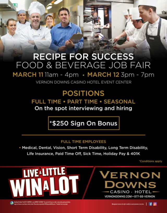 Vernon Downs is gearing up for the 2020 racing season and we will be holding two Food & Beverage hiring events next week, Wednesday, March 11th from 11:00 am - 4:00 pm and also Thursday, March 12th from 3:00pm - 7:00pm at the Vernon Downs Hotel Casino Event Center, 229 Stuhlman Rd, Vernon, NY.