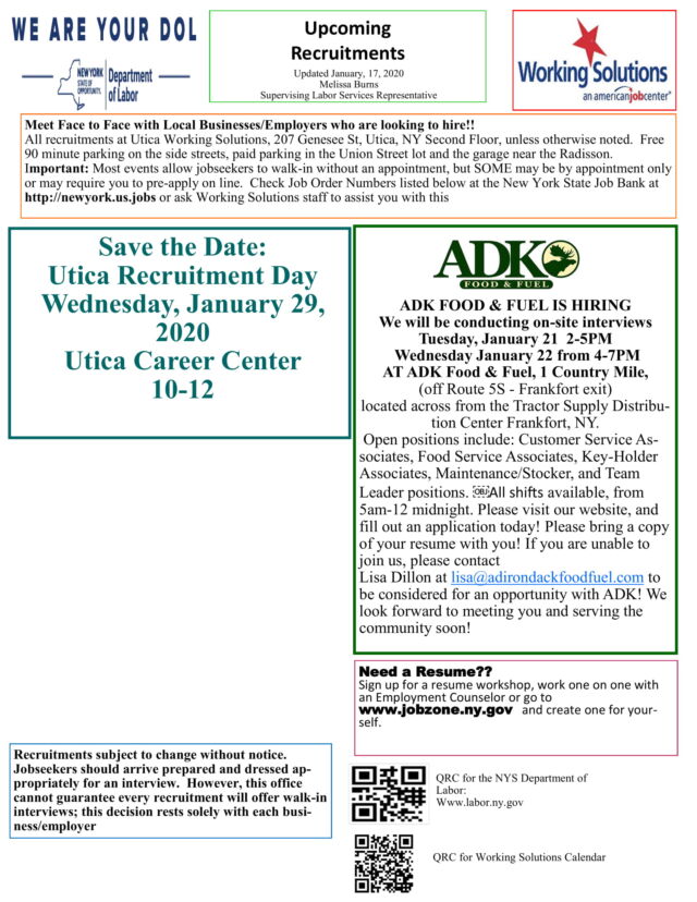 The Utica Mini Job Fair is happening next week on Wednesday, January 29th from 10:00 am to 12:00 pm at Utica Working Solutions, 207 Genesee Street, 2nd Floor. There will be plenty of great opportunities, so be sure to bring copies of your resume!
