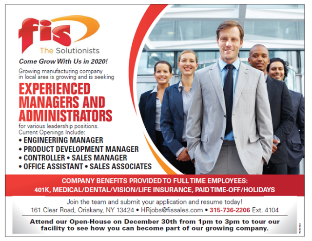 FIS is having a Career Open House event on Monday, December 30 from 1:00 pm to 3:00 pm at their location 161 Clear Road in Oriskany. FIS is growing and investing in their human capital for the future. See the flyer for more information!