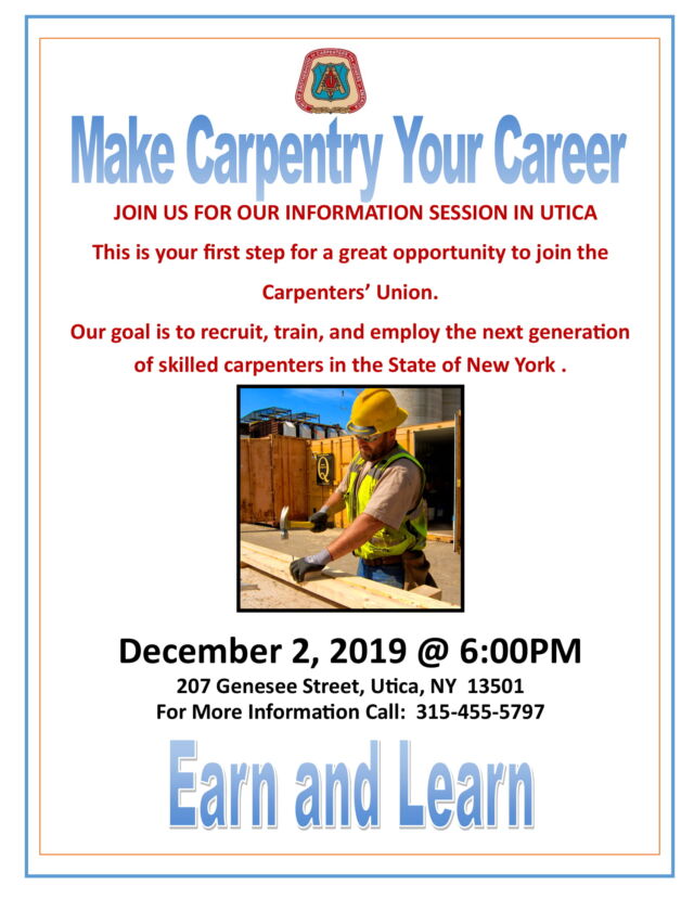The New England Regional Council of Carpenters will hold an information session for anyone interested in becoming an Apprentice Carpenter on Monday, December 2, 2019 from 6:00 pm to 8:00 pm at the State Office Building, 207 Genesee Street Utica on the 1st floor.