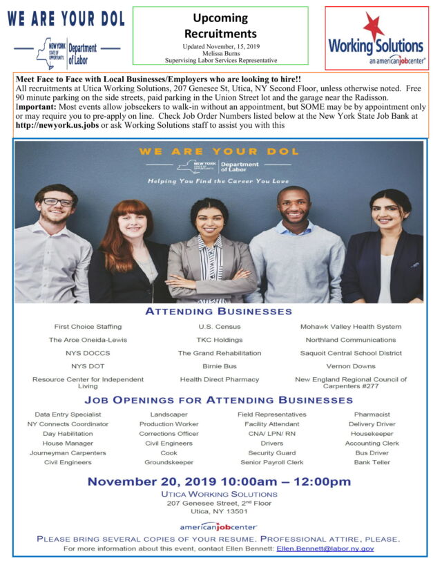 If you would like to learn more or if you are a business who would like to attend the job fair, please contact: Art Rapp, 315-798-3679 or