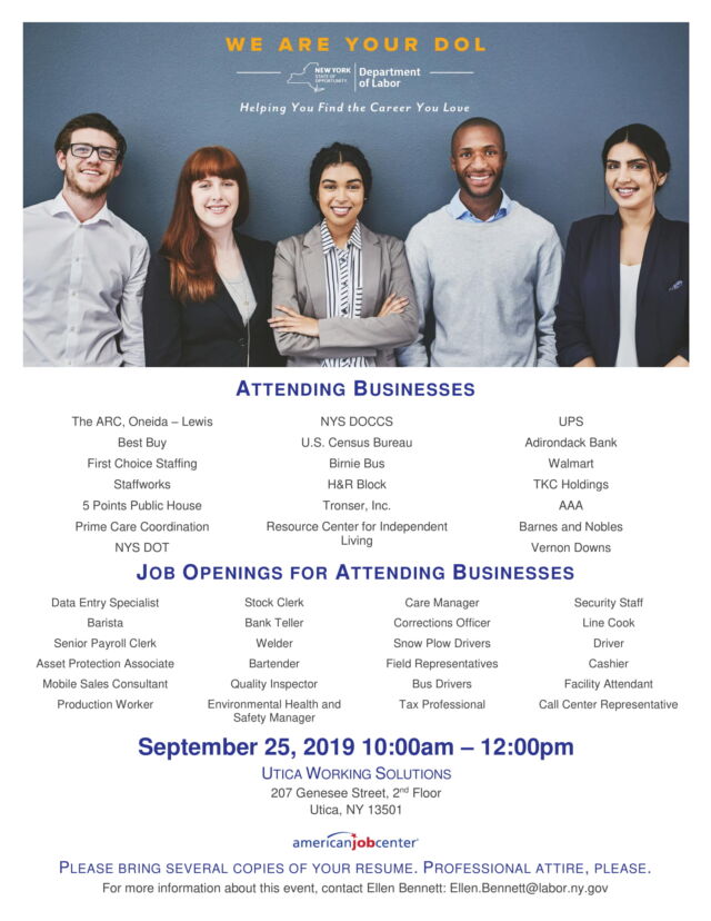 The Madison County Career Center will be hosting a Job Fair at their location, 133 N. Court St. in Wampsville on Wednesday, October 2nd from 10am-12pm. Five businesses with various openings in production, agriculture, home healthcare, human services and transportation will be onhand accepting resumes and conducting interviews.