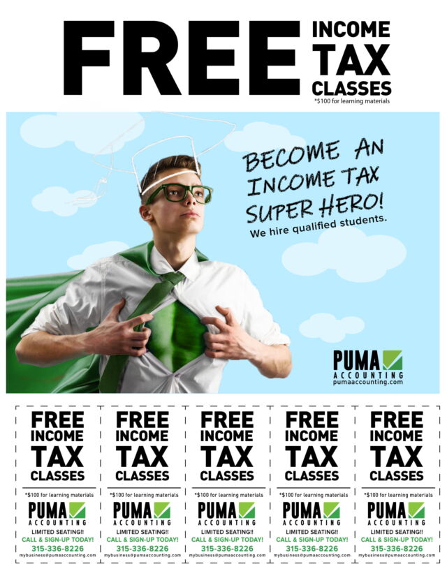 Puma Accounting in Rome is offering tax classes with the opportunity to be hired after the class is completed. Seats are limited so be sure to sign up today by calling 315-336-8226!