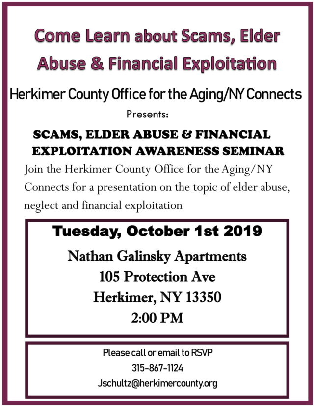 Herkimer County Office for the Aging/NY Connects and Law Enforcement will be providing a presentation on Scams & Elder Abuse on Tuesday, October 1st at 2:00 pm at Galinsky Apartments in Herkimer. See the flyer below for more information.