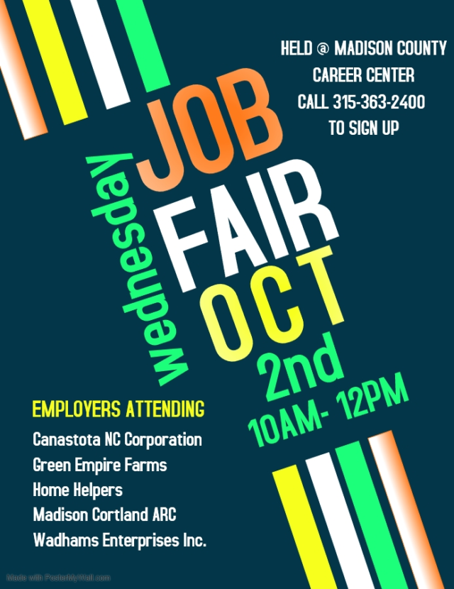 There will be a job fair happening on Wednesday, October 2nd from 10:00 am to 12:00 pm at the Madison County Career Center. Several employers will be in attendance with some great opportunities! If you're interested in attending please call the career center at 315-363-2400 to sign up.