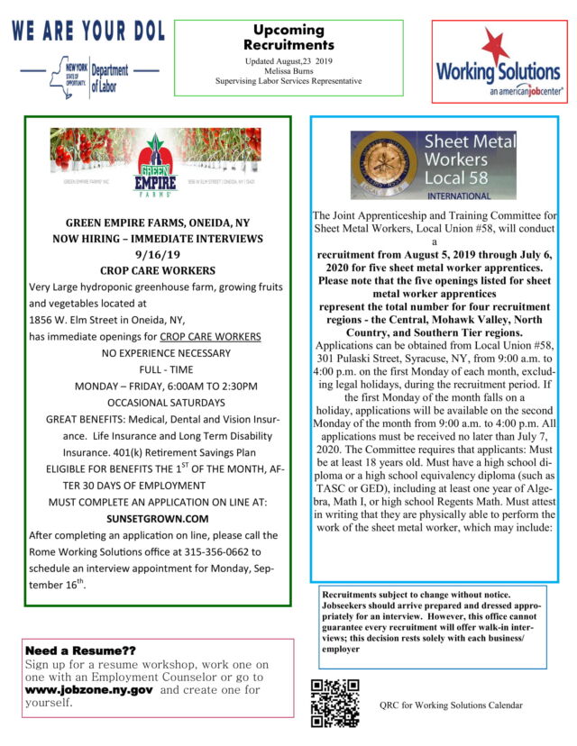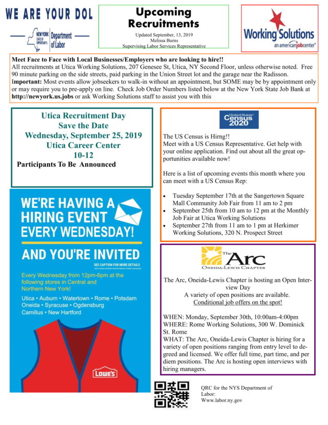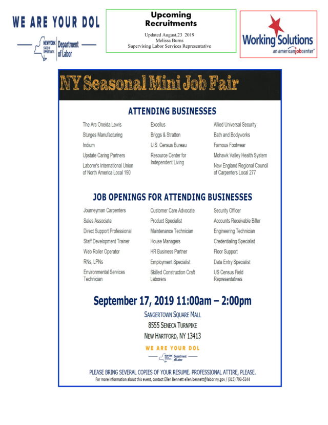 There will be a Job Fair in center court at the Sangertown Square Mall in New Hartford on Tuesday, September 17th from 11am-2pm. Over 20 businesses will be on hand accepting resumes and conducting interviews. If you are looking for a new career in the fields of carpentry, human services, insurance, retail, security, healthcare, or customer service, then check it out. Professional attire is encouraged.