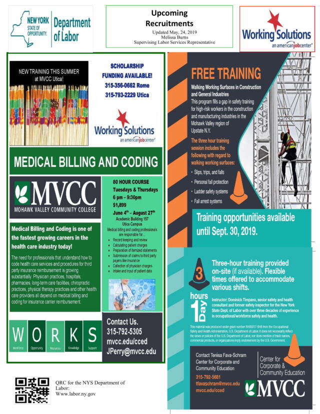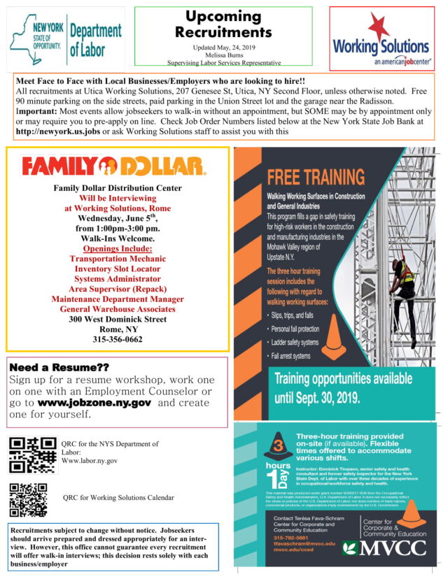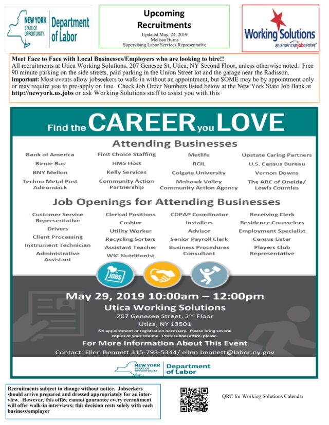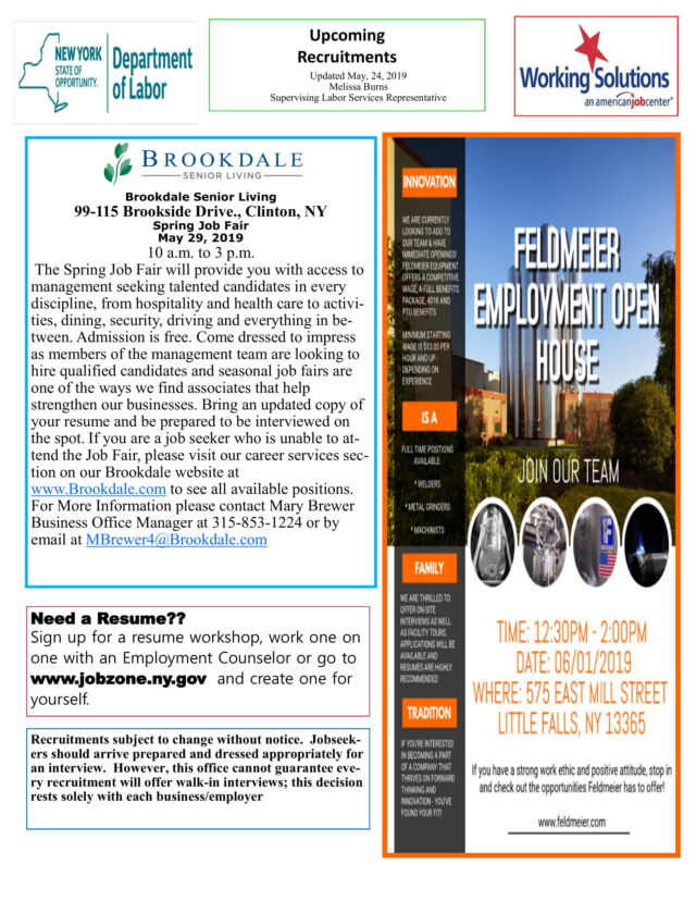A local human services agency will recruiting onsite at the Rome Working Solutions, 300 W. Dominick St. in Rome on Wednesday, June 5th from 10am-12pm. They will be interviewing for Direct Support/Day Habilitation Specialists, Employment Specialists, and more. Bring a resume and be prepared to interview