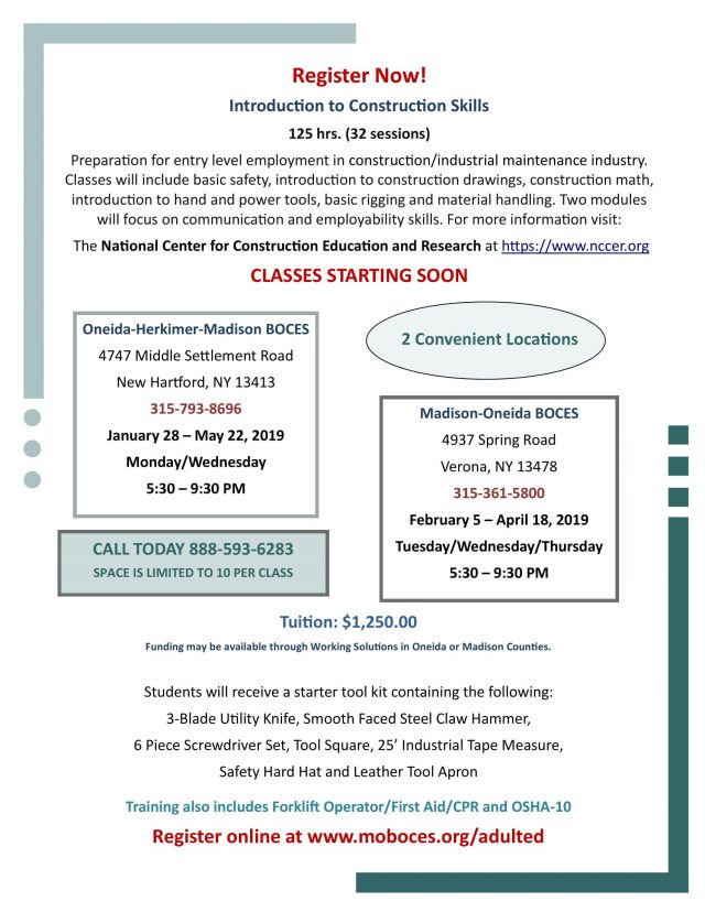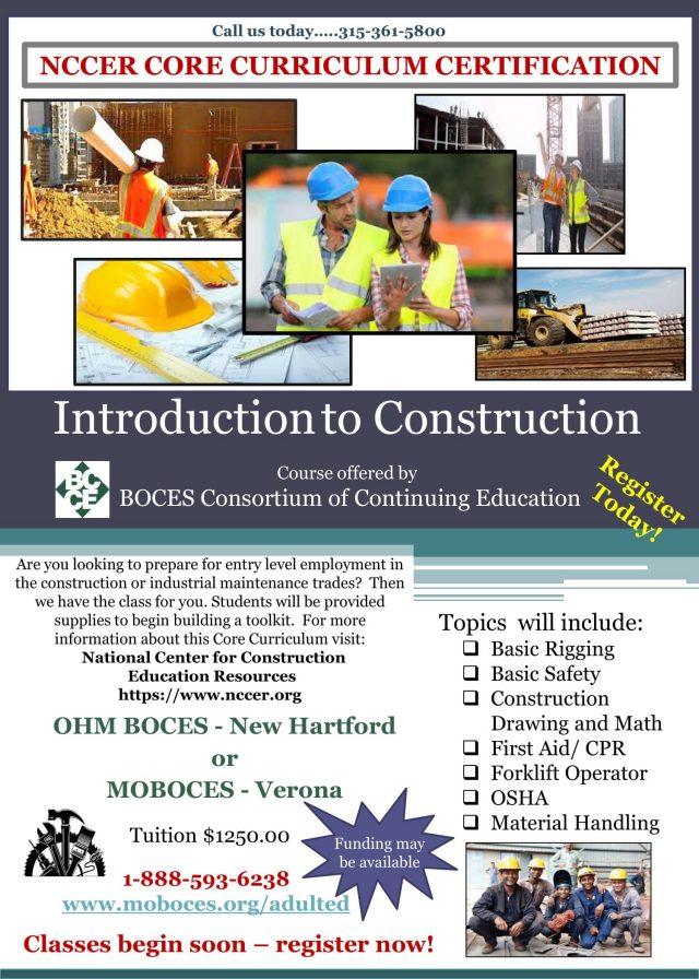 A new Introduction to Construction Vocational Program is beginning shortly at OHM and MOBOCES! If you're interested in this program, please contact Natalie Zumpano at OHM (315-793-8563) or Serena Belmont (315-361-5807) at the Verona office asap….classes start soon!